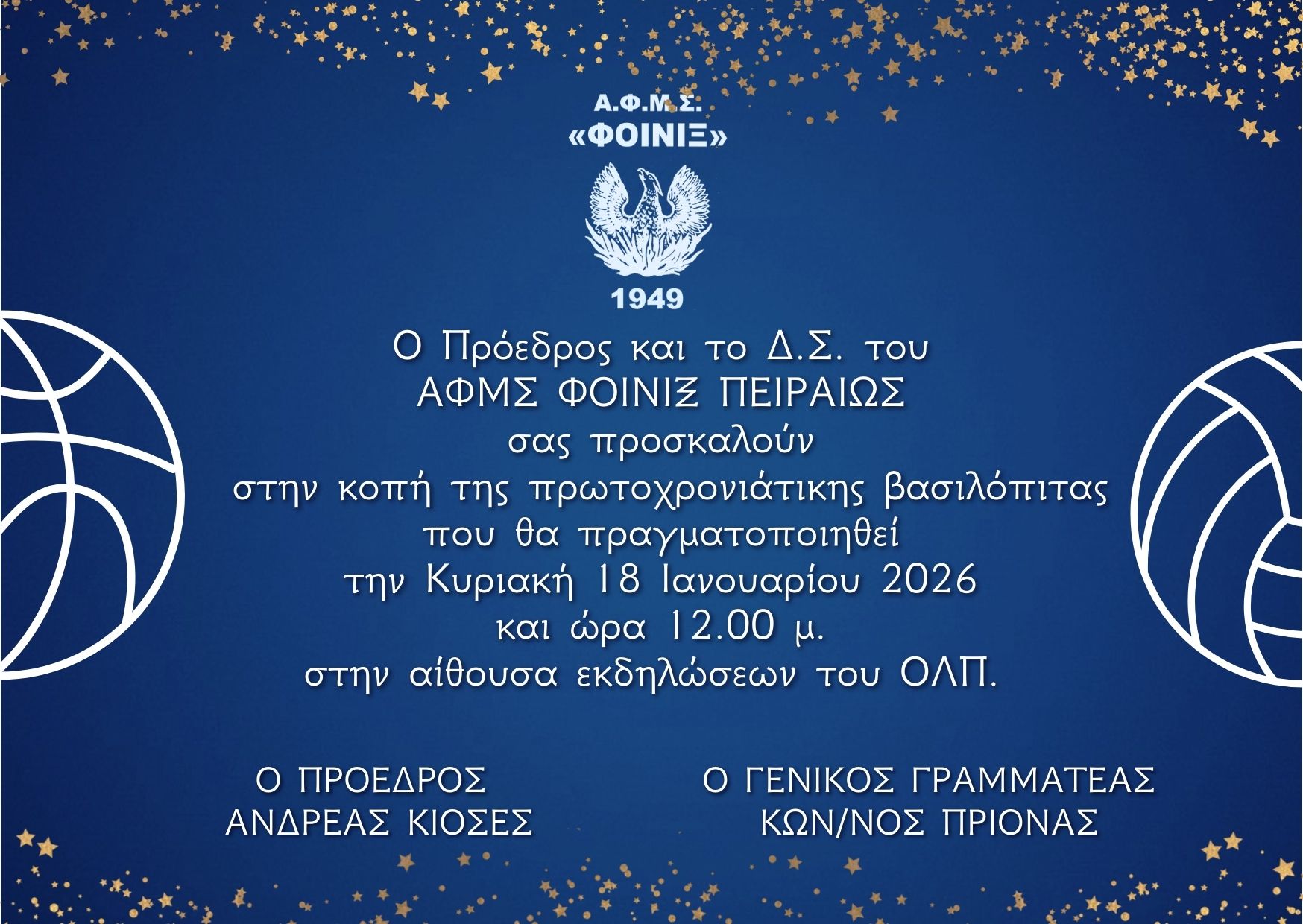 Σας περιμένουμε όλους στην κοπή της πρωτοχρονιάτικης βασιλόπιτας του συλλόγου μας που θα γίνει την Κυριακή 18/1/2026 και ώρα 12μ. στην αίθουσα εκδηλώσεων του ΟΛΠ (Ακτή Μιαούλη 10).